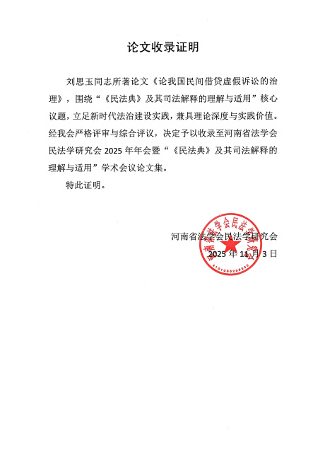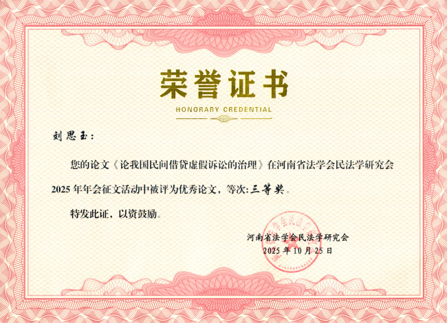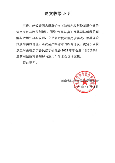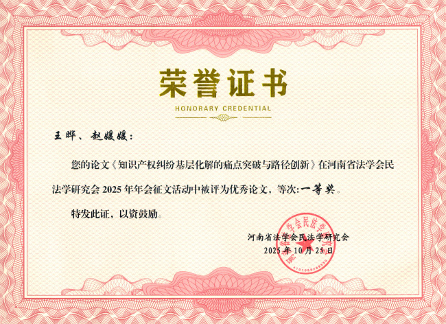 近日,在河南省法学会民法学研究会论文评选活动中,我院干警在院领导的高度重视与悉心指导下,深耕司法实践、聚焦理论创新,积极撰写学术论文参与评选,其中,院党组书记、院长王晔、审管办(研究室)法官助理赵媛媛撰写的《知识产权纠纷基层化解的痛点突破与路径创新》获一等奖,审管办(研究室)科员刘思玉撰写的《论我国民间借贷虚假诉讼的治理》获三等奖,并同时被河南省法学会民法学研究会2025年年会暨“《民法典》及其司法解释的理解与适用”学术会议论文集收录。为我院创优活动注入强劲动力,也彰显了我院党组以研促优、强能提质的正确引领!